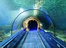 In a 30-metre (98 ft) tunnel through an aquarium containing nearly 2,000,000 litres (530,000 US gal) of water, visitors are surrounded by sharks and manta rays.