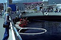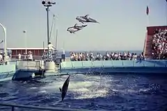 Marineland was best known for its performing orcas. One tourist guide in 1974 stated, “Entertainment is the first purpose of this well-known Palos Verdes show place. Here’s a rare opportunity to see a ‘killer whale’ leaping 18 feet out of the water to grab a fish from the teeth of its trainer, a dolphin jumping through a fire-ringed hoop, or a sea lion crooning a tune.”[2]
