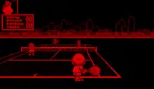 Mario's Tennis is a sports game in which the player controls one of seven different Mario characters and engages in tennis matches.[2] The action on the court is viewed from directly behind the player character from a third person perspective. The Virtual Boy's stereoscopic 3D graphics allow the player to perceive depth within the tennis court, allowing for better perception in the distance between a tennis ball and the respective character.[1] Unlike later entries in the Mario Tennis series, which added gameplay elements not present in tradition tennis, such as "power up items", special "power shots", or external obstacles interfering with the game, Mario's Tennis simply focuses on tennis fundamentals.[1][3]