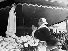 Cardinal Tedeschini, who was present at the consecration in 1917, added his view to the coincidence: "The pontificate of Pius XII is focused on Fátima, May 13. It was Our Lady of Fátima, who connected with the person and future of Eugenio Pacelli, having him consecrated through the hands of Pope Benedict XV to the fullness of priesthood at the very day and hour in which the Most Blessed Virgin with her messages first descended to Fátima. May 13 is engraved in all our hearts, how much more in the heart of this Pope.[37]