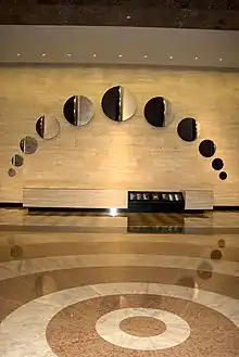 In 2010 a 15-year retrospective of Borgelt's work, Mind and Matter, was held at Drill Hall Gallery at the Australian National University in Canberra. Her diverse use of mediums and documentation of large-scale commission works illustrated her ongoing investigation of optics, structures and natural elements.[29] In 2011 she was commissioned by Bates Smart to create Candescent Moon, a large-scale work of a lunar cycle for 101 Collins Street, Melbourne. An optical illusion plays with the eye when moving from one side to the other, encouraging interactivity with the work. In 2016 a 20-year survey, Marion Borgelt: Memory & Symbol, was held at the Newcastle Art Gallery. These works, spanning from 1993 to 2016, prompted recognition of the invention, consistency and versatility in Borgelt's practice.[30] In 2017 Borgelt was commissioned to create a kinetic work that spans a three-storey atrium for Baker McKenzie at Tower One, Barangaroo, New South Wales. The motorised work, Cascadence, alludes to the notion of descending droplets as coloured elements rotate. In 2018 Borgelt was commissioned by Melco Crown Resorts in Macau to create a suite of large digital face-mounted photographs for 52 lift lobbies of the Morpheus (hotel), design by Zaha Hadid Architects.[31]