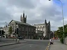 Amongst the buildings demolished to make way for the new frontage of Marischal College at the turn of the 20th century, was the Greyfriars collegiate church, built in 1532 and incorporated as part of the College in 1593. Following a dispute regarding the conservation of this church, a new church building was constructed within the Marischal College complex. It is incorporated into the College frontage, which includes the southern tower, notable for being surmounted with a spire.[18]