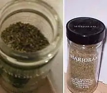 Marjoram has long been used as a medicinal herb. Marjoram or marjoram oil has been used to treat cancer, colds, coughs, cramps, depression, as a diuretic, ear infections, gastrointestinal problems, headaches, and paralysis, as well as arthritis, chest congestion, and muscle aches. It has also been used as an aphrodisiac, mouthwash, tea, and in poultices, tinctures, and infusions.[18][19][20][21][22] Though not all of its historic uses are scientifically backed, the plant has verifiable medical use. For example, it contains the phenol carvacrol, which is antibacterial, antifungal and antimicrobial.[23][24] Ethanol extract is cytotoxic against fibrosarcoma cell lines, ethyl acetate extract has antiproliferative properties against C6 and HeLa cells, as have hesperetin and hydroquinone, which can be isolated from marjoram extract.[25] Cardioprotective, hepatoprotective, antiulcerogenetic, anticholinesterase, anti-PCOS, and anti-inflammatory effects were also found in dried marjoram, marjoram tea, or in compounds extracted from marjoram.[25] Marjoram is generally not toxic, but should not be used by pregnant or lactating women.[25] However, it is always important to be cautious and consult a doctor when using medical herbs.[26]