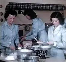 She interviewed "eligible bachelors" and visited movie stars like Joan Crawford, Dolores del Río, Jean Harlow, Clark Gable and Cary Grant to ask them about their life at home.[15][2] She created games and quizzes and drama pieces based on letters she received. During World War II, Crocker starred in Our Nation's Rations and after the war Husted helped start The Betty Crocker Magazine of the Air.[22] Shapiro says, "Under her direction, Betty Crocker became a figure of dignity who treated homemakers with respect."[23] Husted strove to make Crocker appear to be a home economist with professional experience, not a home cook.[9] By 1948, Betty Crocker was known to 91 percent of American homemakers.[15]