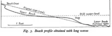 One of the many articles Sweeting published was Wave-Trough Experiments on Beach Profiles. In 1834, H.R. Palmer was the first person to study the connection between wave frequency and beach configuration. It was hard to distinguish whether the beach profiles were in fact due to wave frequency or just a result from natural conditions so experiments were performed in the Physical Geography Laboratory of the Cambridge Geography Department. Figure 3 shows the effects of long waves (low frequency) on beach configuration and figure 4 shows the effects of short waves (high frequency) on beach configuration.[21] Sweeting concluded that although many factors affect beach configuration such as the composition of the beach and the angle of which it lays at, frequency of waves does in fact play the biggest role. This is because there is a notable and evident relationship existing between wave action and beach profile. Rock and land configuration are heavily affected by catastrophic and uniform events. The wave model created by Sweeting showcases two beach profiles, destructive and constructive. The latter were high frequency waves and the former due to low, This was a crucial geological finding because using the landscape or configuration of the beach, past events and happenings could be revealed. Essentially, the contribution and correspondence of wave frequency with beach profile was incredible research which enhanced Sweeting’s success in Geology [21]
