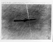 To avoid "shaking hands with St. Peter" (as Lockwood put it),[27] E.A. Johnson, USNR, supervised by Taylor, dropped dummy warheads filled with sand from a crane raised to a height of 90 feet (27 m). In 7 out of 10 of these trials, firing mechanisms bent, jammed, and failed with the high inertia of a straight-on hit (the prewar ideal).[28] A quick fix was to encourage "glancing" shots[29] (which cut the number of duds in half),[28] until a permanent solution could be found. Lightweight aluminum alloy (from propellers[28] of Japanese planes shot down during the attack on Pearl Harbor) was machined to take the place of the Mark 6's heavy pin block so inertial forces would be lower. Electrical switches, developed by Johnson,[28] were tried as well. Both fixes worked and were relatively easy to implement. In September 1943, the first torpedoes with new contact pistols were sent to war.[30] "After twenty-one months of war, the three major defects of the Mark 14 torpedo had at last been isolated. ... Each defect had been discovered and fixed in the field—always over the stubborn opposition of the Bureau of Ordnance."[29]
