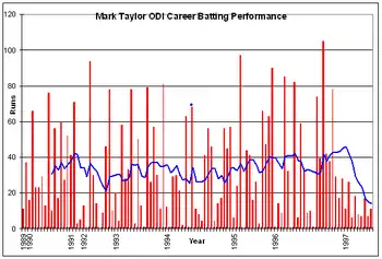 A year after his Test debut, Taylor was selected to make his ODI debut, which came on Boxing Day of 1989 against Sri Lanka. He made 11 as Australia won by 30 runs.[11][12] He was selected for nine of Australia's ten ODIs for the season's triangular tournament, scoring 294 runs at 32.66 with two half-centuries. His highest score of 76 came as Australia defeated Pakistan by 69 runs to clinch the finals series in Sydney.[11][12] The season ended with ODI tournaments in New Zealand and Sharjah. He played six of the eight matches, scoring 222 runs at 37.00 with two half-centuries, but was dropped for the final in New Zealand.[11][12]