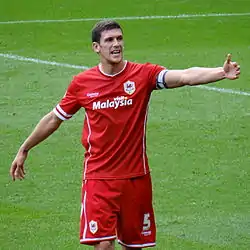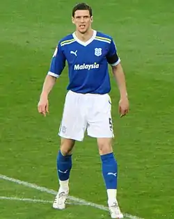 At the start of the 2010–11 season, loan signing Craig Bellamy was appointed team captain,[74] with Hudson maintaining the role of club captain.[75] He was ever-present from the start of the 2010–11 season until 19 March 2011, when he suffered a knee injury in a 3–3 draw with Millwall which ruled him out for up to six weeks.[76] Despite reports claiming Hudson would be out for the season, he returned in Cardiff's 1–0 victory over Preston North End on 25 April.[77] He started the final game of the season against Burnley but was taken off with another injury after 30 minutes.[78] Again reports of Hudson's season being in doubt were proven wrong as he was cleared for the first leg of Cardiff's second consecutive play-off participation.[79] Cardiff drew the first match against Reading 0–0 at the Madjeski Stadium, before losing 3–0 in the return leg.[80]