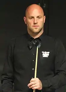 King began the 2012–13 season by failing to qualify for three of the first four ranking events.[23] The one he did reach was the Shanghai Masters, where he beat Zhao Xintong 5–3 in the wildcard round and local favourite Ding Junhui 5–4 in the first round, having trailed 0–3.[24] He lost 3–5 to Shaun Murphy in the following round.[25] King saw off Mark Williams 6–3 in the first round of the 2012 UK Championship, before surrendering a 3–0 lead against 17-year-old Luca Brecel to lose 4–6.[26] He also reached the second round of the German Masters by whitewashing Stephen Maguire 5–0, but then lost in a deciding frame to Matthew Stevens.[23] King failed to qualify for the World Open and lost in the first round of the Welsh Open and China Open.[23] He faced Mark Allen in the opening round of the World Snooker Championship and produced a big shock by fighting back from 6–8 down to produce his best snooker at the end of the match in a 10–8 win.[27] He raced into a 6–2 lead in the first session of his second round match against Ding Junhui, before falling 7–9 behind in the next session and ultimately lost 9–13.[28] King ended the season ranked world number 29.[29]