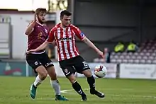![]() Mark Timlin (right) playing for Derry City against Alex Byrne (left) playing for Galway United at the 2017 EA Sports Cup at Eamonn Deacy Park | |||