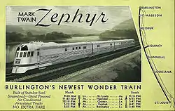 The Mark Twain Zephyr was an early diesel four-unit articulated zephyr train that was similar to the Pioneer Zephyr in style. The train was built by the Budd Company and was powered by a diesel engine produced by the Winton Engine Company. The train was named after the renowned author Mark Twain because it was scheduled to provide service from St. Louis, Missouri to Burlington, Iowa via Hannibal, Missouri, his hometown. The train's exterior structure used stainless steel, and had a "shovel nose" front.[1]