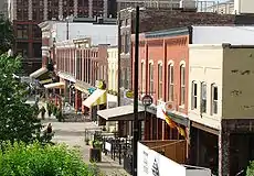 Land for the market place was given to the city by William G. Swan and Joseph A. Mabry.[3] Farmers from the surrounding area would bring their wagons to the Market House, where they sold their produce and wares.[4] During the Civil War, the Union Army used the Market House as a barracks and magazine.[5]: 23–25 Knoxville's post-Civil War population boom brought about continued development in Market Square, most notably the construction of Peter Kern's confections store (now The Oliver Hotel) in 1876 and Max Arnstein's seven-story department store in 1906. After the Market House damaged by fire in 1960, the remainder of the building was demolished, and Market Square was converted into a pedestrian mall.[1]