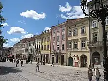 Rynok Square (Ukrainian: Площа Ринок, Polish: Rynek we Lwowie, German: Ring) is a central square of the city of Lviv, Ukraine. According to archaeological data, the square was planned in the second half of the 13th century, during the reign of Prince Leo I of Galicia.[1][2] However, there is a long tradition of later dating the emergence of the square, associated with the activities of the Polish king Casimir III the Great.[3]
