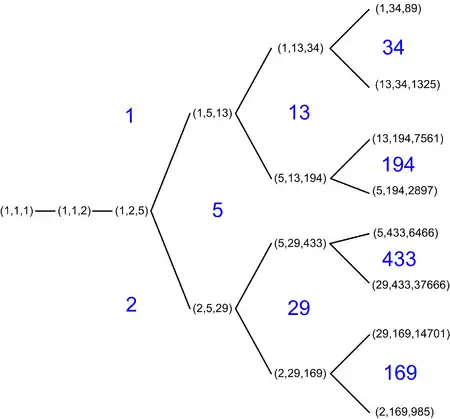 There are two simple ways to obtain a new Markov triple from an old one (x, y, z). First, one may permute the 3 numbers x,y,z, so in particular one can normalize the triples so that x ≤ y ≤ z. Second, if (x, y, z) is a Markov triple then by Vieta jumping so is (x, y, 3xy − z). Applying this operation twice returns the same triple one started with. Joining each normalized Markov triple to the 1, 2, or 3 normalized triples one can obtain from this gives a graph starting from (1,1,1) as in the diagram. This graph is connected; in other words every Markov triple can be connected to (1,1,1) by a sequence of these operations.[1] If we start, as an example, with (1, 5, 13) we get its three neighbors (5, 13, 194), (1, 13, 34) and (1, 2, 5) in the Markov tree if z is set to 1, 5 and 13, respectively. For instance, starting with (1, 1, 2) and trading y and z before each iteration of the transform lists Markov triples with Fibonacci numbers. Starting with that same triplet and trading x and z before each iteration gives the triples with Pell numbers.