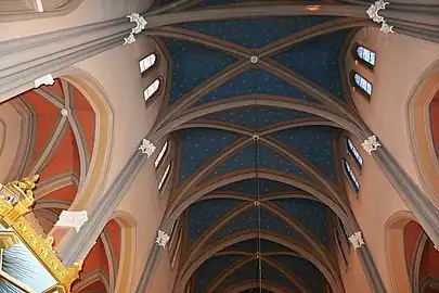 The model of the church without transept was the Friedrichswerder Church. The Marktkirche was the first all-brick building in the Duchy of Nassau. The west tower makes it the tallest building in the city. The interior has a length of 50 m, a width of 20 m and a height of 28 m and is encircled by galleries. The vaulted ceiling is painted as a starry sky.[2][3]