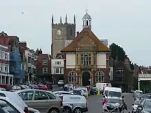 On 28 April 1653 the Great Fire of Marlborough started in a tanner's yard and spread quickly, eventually after four hours burning the Guildhall, St Mary's Church, the County Armoury, and 244 houses[11] to the ground.[12] This event attracted more than local attention; the parish register of Wotton-under-Edge, in the west of Gloucestershire, records on 9 August 1653 that 18 pounds 17 shillings and six and a half pence had been collected in the parish for the relief of the distressed inhabitants of Marlborough. During the rebuilding of the town after the Great Fire, the high street was widened and is often claimed to be the widest in England though the actual widest is in Stockton-on-Tees. This wide street allows ample space for the local market. Fire swept through the town again in 1679 and 1690. This time, an Act of Parliament was passed "to prohibit the covering of houses and other buildings with thatch in the Town of Marlborough".[13]
