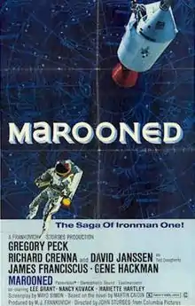 Marooned is a 1969 American science fiction film directed by John Sturges and starring Gregory Peck, Richard Crenna, David Janssen, James Franciscus and Gene Hackman about three astronauts who are trapped and slowly suffocating in space.[3] It was based on the 1964 novel Marooned by Martin Caidin. While the original novel was based on the single-pilot Project Mercury, the film depicted an Apollo command and service module with three astronauts and a space station resembling Skylab. Caidin acted as technical adviser and updated the novel, incorporating appropriate material from the original version.
