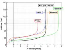 ![]() Comparison of altitude (y-axis) and velocity (x-axis) of various Mars landers |