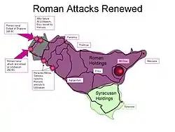 The Roman fleet was defeated at Drepana in 249 BC when attempting a surprise attack there, followed by the destruction of the rest of the fleet soon afterwards in a storm. This forced the Romans to settle in for a long siege.[16]