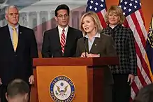 In November 2007, Blackburn unsuccessfully ran for Republican conference chair.[23][24][25] She was a senior advisor on Mitt Romney's 2008 presidential campaign, before resigning her position in the Romney campaign and endorsing Fred Thompson for president.[26][27] Blackburn was an assistant whip in Congress from 2003 to 2005, as well as deputy whip from 2005.[28][29][30][31]