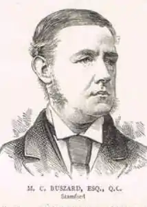 Buszard was born in Lutterworth. Leicestershire, the eldest son of Marston Buszard MD and his wife Sarah Catherine Clarke, eldest daughter of John Clarke of Peatling Hall who was High Sheriff of Leicestershire in 1820. Buszard was educated at Rugby School and at Trinity College, Cambridge,[2] where he was awarded BA 1st Class in Law and 12th senior optime in 1860, the Chancellor's medal for Legal Studies in 1863 and MA and LLM in 1863. He was called to Bar at Inner Temple in 1862 and became Queen's Counsel in 1877 and a Bencher of his Inn in 1880.[3] Buszard was leader of the Midland Circuit for 31 years and was leading counsel to the Post Office on the Midland Circuit.