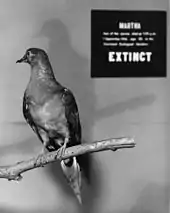 From the 1920s through the early 1950s she was displayed in the National Museum of Natural History's Bird Hall, placed on a small branch fastened to a block of Styrofoam and paired with a male passenger pigeon that had been shot in Minnesota in 1873.[16][17] She was then displayed as part of the Birds of the World exhibit that ran from 1956 to 1999.[16] During this time she left the Smithsonian twice—in 1966 to be displayed at the Zoological Society of San Diego's Golden Jubilee Conservation Conference, and in June 1974 to the Cincinnati Zoo for the dedication of the Passenger Pigeon Memorial.[16] When the Smithsonian shut down its Birds of the World exhibit, Martha was removed from display and kept in a special exhibit at the Cincinnati Zoo.[5][17] Martha was back on display in the Smithsonian from June 2014 to September 2015 for the exhibit Once There Were Billions.[18] Martha has been on public display in the Smithsonian's "Objects of Wonder" exhibit alongside a Mountain Gorilla skull since March 10th, 2017. She will remain on display there until the exhibit's scheduled closure in 2025.[19]