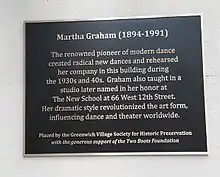 Graham began teaching in her studio at 66 Fifth Avenue, near 13th Street, and at the Neighborhood Playhouse in New York. Here she taught her special dance technique to the women who would become the first members of her dance company. They would practice new works for nine months and then give recitals in New York and abroad. During the years of 1938 and 1939, men joined the troupe. Later on, financial troubles would plague the company. At these times, Graham was supported by individual patrons. One of the contributors, Mrs. Wallace, made it possible for the Martha Graham Center of Contemporary Dance find its current home at 316 East 63d Street.[3]