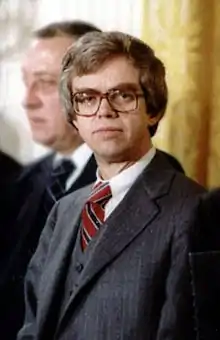 After Reagan’s 1980 election to president, Anderson, reporting to Edwin Meese III, participated in a broad range of decision-making activities.[60][61][62] He studied the transitions of the Ford and Carter administrations[63] and developed a methodical briefing procedure for new cabinet officers that ensured they would “not betray the policies the campaign was fought on.”[64] He also produced and gave to each cabinet secretary a notebook with policy positions relevant to their area.[65][66]