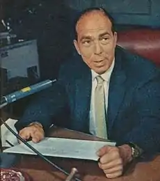 In the 1940s Block hired a young record collector, Joe Franklin, as his "record picker." Franklin went on to host his own radio and television programs in the New York City market for more than 65 years.[18][19] In 1947, there were two daily editions of the Make Believe Ballroom: one in the late morning and another around dinner time.[20] The illusion was shattered by a 1948 musical short in which Block talked about the show while sitting in front of his extensive record library. He also did a weekly international version of Make Believe Ballroom for Voice of America beginning in 1949.[6][21] When Block heard that Voice of America would begin broadcasting a popular music program, he volunteered to host the show without pay.[22]