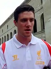 Ahead of the 2008–09 season he received a first-team squad number.[12] He earned his first call up to the senior team in November 2008 when he was an unused substitute in Liverpool's UEFA Champions League group stage match against Marseille.[13] Not long after, he debuted as a substitute for Jamie Carragher in the same competition against PSV Eindhoven on 9 December 2008.[14]
