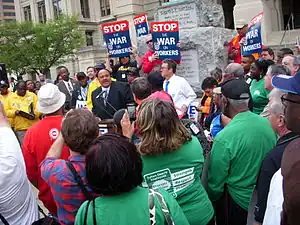 Martin Luther King III spoke on behalf of the 2008 Democratic Party presidential nominee, Senator Barack Obama, at the Democratic National Convention on August 28, 2008. The event marked the 45th anniversary of the "I Have a Dream" speech and the first time an African American accepted the presidential nomination of a major party.[23] King said his father would be "proud of Barack Obama, proud of the party that nominated him, and proud of the America that will elect him".[24] However, he also warned that his father's dream would not be completely fulfilled even if Obama won the presidency, because the country was suffering from a poor health care system, education system, housing market and justice system, and that "we all have to roll up our sleeves and do work to ensure that the dream that he shared can be fulfilled".[23]