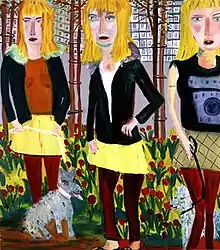 Martin Maloney practises deliberately "bad" painting, where images (mainly figures) are achieved with apparently inept draughtsmanship and crude painting. Through his expressionistic style, strong colours, and humorous subject matter, Maloney's paintings record everyday experiences and moments of awkward intimacy. He often incorporates references to art history, from Vermeer to Georg Baselitz.