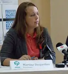 Martine Desjardins is a Canadian activist and media figure from Quebec. She was president of the Fédération étudiante universitaire du Québec during the 2012 Quebec student protests and was a Parti québecois candidate in the 2014 Quebec general election.[1][2][3][4][5] Since then, she has been a political commentator for Le Canal Nouvelles, and was president of the Mouvement national des Québécoises et des Québécois from 2015 to 2017.[6][7]
