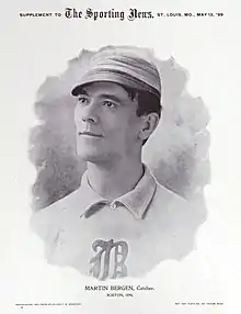 Bergen's teammates appreciated his strong arm and hustling style of play, but relations between the catcher and the team soured quickly. An article from May 1896 related how "Martin Bergen, the young backstop […] is unpopular with his fellow players on the Boston team. Bergen is a sullen, sarcastic chap, never associates with the players, and always nurses a fancied grievance. His disposition handicaps his playing talents."[3] While the team was on a road trip to St. Louis in 1898, Bergen slapped teammate Vic Willis while the ballclub was eating breakfast. He threatened to club his teammates to death at the end of the year. The team's mixed emotions were expressed by an anonymous Boston player quoted in the press: "He has made trouble with a good many of the boys and we just give him a wide berth. But he's a ballplayer, and once we get into a game, personal feelings are set aside in admiration of the artist, for such he is."[3][12]