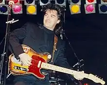 Stuart's guitars also include 'Clarence', the familiar two-tone Fender Telecaster, once owned by Clarence White. This instrument,[31][32] is the original B-Bender guitar, built by White and Gene Parsons around 1967, designed to allow the guitarist to manually raise the guitar's 'B' string one whole step to play in a style similar to a pedal steel guitar. Stuart bought this unique guitar in 1980 from White's widow.[33]