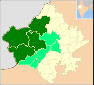 ![]() Dark green indicates primary Marwari-speaking region, light green indicates additional dialect areas who count themselves as Marwari | |
