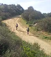 On the ridgetop is the unpaved section of Mulholland Drive, closed to cars, for hiking and vistas north over the Valley and south over the Los Angeles Basin to the Pacific Ocean.