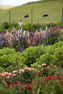 Butters also ran a u-pick membership organization. For a $100 fee and the cost of production, a household was given permission to collect produce and eggs from the greenhouses, fields, orchard, and chicken coop during daylight hours, seven days a week.[27] Members could also gather flowers, picnic on the farm, or visit animals. Butters’ goal in starting the country club, according to son-in-law Lucas Rae, was to give others a chance to live out their “farm fantasy” and educate families about the source of their food.[28] Butters has also said that she wanted to combat the culture of convenience food, which has “created a nutritional famine”.[29]