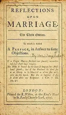 In 1700, Astell published Some Reflections upon Marriage.[19] She critiques the philosophical underpinnings of the institution of marriage in 1700s England, warning women of the dangers of a hasty or ill-considered choice. The Duchess of Mazarin is used as an example of "the dangers of an ill Education and unequal Marriage". Astell argues that education will help women to make better matrimonial choices and meet the challenges of the married state: "She has need of a strong Reason, of a truly Christian and well-temper'd Spirit, of all the Assistance the best Education can give her, and ought to have some good assurance of her own Firmness and Vertue, who ventures on such a Trial".