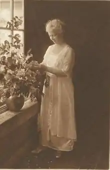 Under her leadership, Pewabic Pottery produced architectural tiles, lamps and vessels. The Pewabic Pottery became known far and wide for its iridescent glazes, and was used in churches, libraries, schools, and public buildings.[2][3] New York architects McKim, Meade & White asked her to create the tiles for the roof garden of the Hotel Pennsylvania. Her work can be seen in Detroit at the Cathedral Church of St. Paul, the crypt church of the Basilica of the National Shrine of the Immaculate Conception,[4] the Fisher Building, and Eliel Saarinen's Kingswood School for Girls.[5]