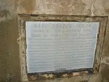 Plaque on the chimney stone memorial of Mary Draper Ingles in the West End Cemetery in Radford, VA. - Radford University, located near Draper's Meadow, has residence halls named Draper Hall and Ingles Hall in honor of Mary Draper Ingles.[39]