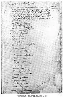 Several of those affected by the events of the Antinomian Controversy went north with John Wheelwright in November 1637 to found the town of Exeter in what would become New Hampshire. A larger group, uncertain where to go, contacted Roger Williams, who suggested they purchase land from the natives along the Narraganset Bay, near his settlement in Providence. On 7 March 1638, just as Anne Hutchinson's church trial was getting underway, a group of men gathered at the home of William Coddington and drafted a compact for a new government. This group included several of the strongest supporters of Hutchinson who had either been disenfranchised, disarmed, excommunicated, or banished, including William Dyer.[38] Altogether, 23 individuals signed the instrument which was intended to form a "Bodie Politick" based on Christian principles, and Coddington was chosen as the leader of the group. Following through with Roger Williams' proposed land purchase, these exiles established their colony on Aquidneck Island (later named Rhode Island), naming the settlement Pocasset.[39]