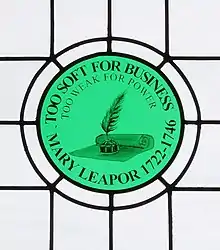 After the "centuries of neglect" recognised by Prof. John Clarke ("Yesterday's Brackley", Barracuda Books, 1990) in a chapter about Mary, a window, inspired by her work and based on a design by a local resident Carolyn Hunter, was created by stained-glass artist Rachael Aldridge and installed on the first floor of the newly refurbished Brackley Town Hall in 2018.