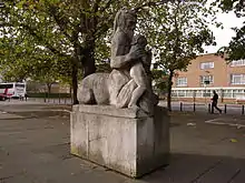 After the War, Watson received several public commissions, often for large architectural pieces. These included two commissions from the architect Sir Frederick Gibberd for Magic Beast for Crofton Common Infant School at Longbridge and for Chiron Teaching the Young Hero for Harlow New Town.[8] A visit to Greece in 1953 inspired Musician, a large Purbeck stone carving which was shown at the Royal Academy in 1955.[8] Seen by Sir Edward Maufe this led to a commission for two gilded limewood angels for Guildford Cathedral.[8] In 1958 Watson completed a commission for Cambridge University, creating a bas-relief series for the exterior of the Chemistry Faculty Building depicting the university arms and five alchemy symbols.[9] Her Four Symbols of the Evangelists, in Purbeck stone, now lead to the north entrance of Wells Cathedral.[2] In 2000, in the churchyard at Langton Matravers, Watson installed Purbeck Quarryman.[10] Watson exhibited with the Fine Art Society, at Foyles Gallery, at the National Society of Painters, Sculptors and Gravers, with the New Art Centre and the Women's International Art Club.[1][11] She had solo shows at Pelter/ Sands in Bristol, at Dorset County Museum and a large retrospective at the Salisbury and South Wiltshire Museum, with pieces shown at Salisbury Cathedral, in 2004.[1][12]