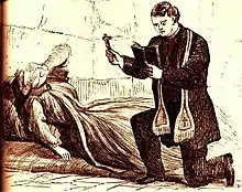 At noon on July 6, Surratt was informed she would be hanged the next day. She wept profusely.[181] She was joined by two Catholic priests (Jacob Walter and B.F. Wiget)[140][182] and her daughter Anna.[179] Father Jacob remained with her almost until her death.[183] Her menstrual problems had worsened, and she was in such pain and suffered from such severe cramps that the prison doctor gave her wine and medication.[140][184] She repeatedly asserted her innocence.[140] She spent the night on her mattress, weeping and moaning in pain and grief, ministered to by the priests.[177][185] Anna left her mother's side at 8 A.M. on July 7 and went to the White House to beg for her mother's life one last time.[185] Her entreaty rejected, she returned to the prison and her mother's cell at about 11 A.M.[186] The soldiers began testing the gallows about 11:25 A.M.; the sound of the tests unnerved all the prisoners.[187] Shortly before noon, Mary Surratt was taken from her cell and then allowed to sit in a chair near the entrance to the courtyard.[187] The heat in the city that day was oppressive. By noon, it had already reached 92.3 °F (33.5 °C).[188] The guards ordered all visitors to leave at 12:30 P.M.[186] When she was forced to part from her mother, Anna's hysterical screams of grief could be heard throughout the prison.[189][190]
