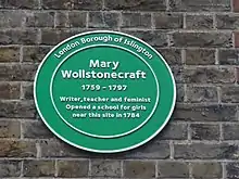 Gradually, Wollstonecraft returned to her literary life, becoming involved with Joseph Johnson's circle again, in particular with Mary Hays, Elizabeth Inchbald, and Sarah Siddons through William Godwin. Godwin and Wollstonecraft's unique courtship began slowly, but it eventually became a passionate love affair.[60] Godwin had read her Letters Written in Sweden, Norway, and Denmark and later wrote that "If ever there was a book calculated to make a man in love with its author, this appears to me to be the book. She speaks of her sorrows, in a way that fills us with melancholy, and dissolves us in tenderness, at the same time that she displays a genius which commands all our admiration."[61] Once Wollstonecraft became pregnant, they decided to marry so that their child would be legitimate. Their marriage revealed the fact that Wollstonecraft had never been married to Imlay, and as a result she and Godwin lost many friends. Godwin was further criticised because he had advocated the abolition of marriage in his philosophical treatise Political Justice.[62] After their marriage on 29 March 1797, Godwin and Wollstonecraft moved to 29 The Polygon, Somers Town. Godwin rented an apartment 20 doors away at 17 Evesham Buildings in Chalton Street as a study, so that they could both still retain their independence; they often communicated by letter.[63][64] By all accounts, theirs was a happy and stable, though brief, relationship.[65]