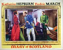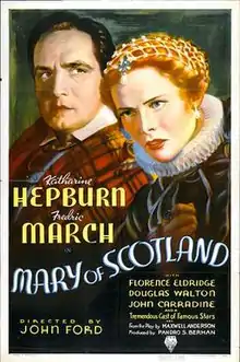 Mary of Scotland is a 1936 RKO film starring Katharine Hepburn as the 16th-century ruler Mary, Queen of Scots.[3][4] Directed by John Ford, it is an adaptation of the 1933 Maxwell Anderson play, with Fredric March reprising the role of Bothwell, which he also performed on stage during the run of play.[5] The screenplay was written by Dudley Nichols. Ginger Rogers wanted to play this role and made a screen test, but RKO rejected her request to be cast in the part[6] feeling that the role was not suitable to her image.