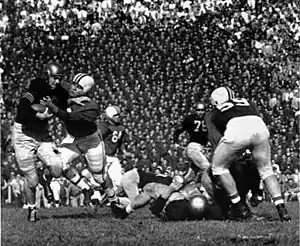 In a surprising choice, former Maryland assistant coach and Citadel head coach Bobby Ross, who was not a big-name at the time, was selected as head coach in 1982. In contrast to Claiborne's style, Ross implemented a high-powered offense. He replaced the I-veer triple option with an NFL-style offense that emphasized dropback passes, bootlegs, and play action passes.[27] This change in tactics and strategy enabled starting quarterback Boomer Esiason the opportunity to excel to a degree not seen under Claiborne the season prior. Esiason said, "Ross has an uncanny knack of putting players in a position to not only succeed, but to overachieve . . . If he didn't show up at Maryland, I don't know what would have happened to me. I don't know if I would have turned into the player I was and played in the NFL."[27] During this time, several Maryland quarterbacks went on to careers in the National Football League (NFL), and the school was nicknamed "Quarterback U" as a result.[28][29]