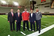 L–R: Unnamed official, Maryland Gov. Hogan, Durkin, UofM Pres. Loh, and AD Anderson during Hogan's visit in 2017, photographed by Tom Nappi at Cole Field House.
