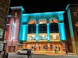The original facade of the theater at 21-25 South Potomac Street was a five-story apartment block. The theater occupies the interior of the first block of South Potomac Street, and was originally entered through the ground floor of the apartments. The chief character of the theater, even prior to the 1974 fire that destroyed the front block and main lobby, was to be found in its interior. The interior is primarily neoclassical in character, with Art Deco influences. The house features a prominent proscenium arch framing the stage house. The auditorium has three boxes on either side of the auditorium level and three to each side on the balcony level, set in an arched niche. The small interior lobby is restrained in its detailing, with a grand stair from the main level to the balcony level. A smaller stair continues to the upper balcony.[2] The current lobby, finished in 2019, spans nearly the full width of the theater and contains the box office, a concession stand, a seating area, two entrances to the main level of the theater house, and a grand stair that diverges at a landing. The upstairs level has two entrances into the balcony level of the theater and a second concession stand and cocktail bar with cafe seating. Another staircase connects the main floor to the basement level, with another seating area and more restrooms.